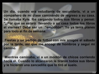 Kyle planeaba suicidarse el fin de semana después de que unos chicos lo molestaran y tiraran sus libros. El narrador lo ayudó y se hicieron amigos. En el discurso de graduación, Kyle contó esta historia y cómo el narrador lo salvó sin saberlo al invitarlo a jugar ese fin de semana. Kyle dijo que pequeños actos pueden cambiar la vida de alguien.
