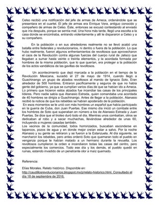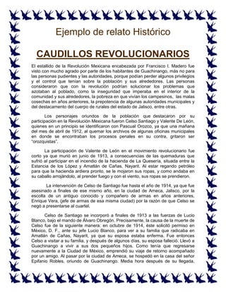 El documento describe la participación de dos caudillos revolucionarios, Celso Santiago y Valente De León, en la Revolución Mexicana en el pueblo de Guachinango. Celso se unió a las fuerzas de Lucio Blanco bajo el mando de Álvaro Obregón en 1913, pero fue asesinado en 1914 en Ameca por orden del jefe de armas local. Valente participó brevemente hasta que murió en 1913 al incendiar una hacienda. El documento también describe un ataque de 500 rebeldes al mando de Ignacio Soto al pue