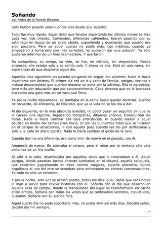 Este documento narra la historia de una mujer que está sufriendo la pérdida de su compañero. Los primeros días después de su muerte, recibe la visita de familiares y amigos que quieren mostrar su apoyo, pero ella sólo siente pena. Pasando los días sola, revisa fotos y recuerdos felices que ahora sólo le traen tristeza. Por las noches, duerme para soñar con momentos felices junto a él. Al cuarto día, decide que ya no puede soportar vivir así y decide dormir siempre para seguir soñando con él.