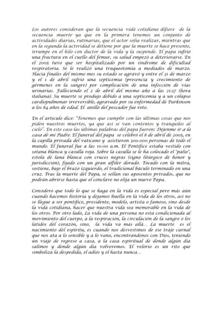 Este artículo analiza el proceso de enfermedad y muerte a través del estudio de dos casos. Describe la enfermedad y muerte del Papa Juan Pablo II debido a una sepsis e insuficiencia cardiopulmonar a los 84 años. Su funeral reunió a 300.000 personas y marcó su estatus como líder espiritual. También explica que la muerte interrumpe la vida cotidiana y cómo los ritos funerarios definen la posición social del fallecido.