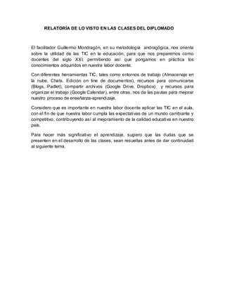 El facilitador Guillermo Mondragón orientó a los estudiantes sobre la utilidad de las TIC en la educación para prepararlos como docentes del siglo XXI y permitirles poner en práctica los conocimientos adquiridos en su labor docente. Usando herramientas TIC como entornos de trabajo en la nube, chats, edición en línea y recursos para comunicarse y compartir archivos, les dio pautas para mejorar su proceso de enseñanza-aprendizaje. El autor considera importante aplicar las TIC en el aula para cu