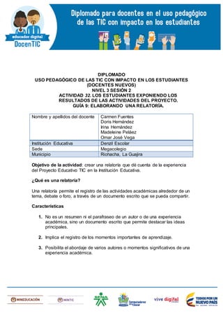 El documento describe una actividad de un diplomado sobre el uso pedagógico de las TIC con impacto en los estudiantes. Los docentes describen una relatoría sobre un proyecto educativo TIC en su institución. La relatoría detalla el nombre del proyecto, área de conocimiento, herramientas TIC usadas, contenidos digitales, ideas principales de aprendizaje, momentos centrales de la aplicación, y conclusiones sobre la importancia de aplicar proyectos educativos con TIC.