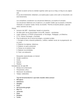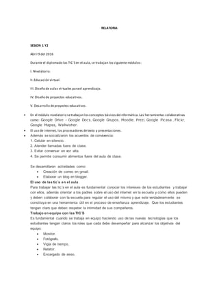 El documento resume las sesiones 1 y 2 de un diplomado sobre el uso de las TIC's en el aula. Se presentan los módulos trabajados, incluyendo conceptos básicos de informática, educación virtual, diseño de aulas y proyectos virtuales. También se describen algunas herramientas digitales trabajadas y acuerdos establecidos.