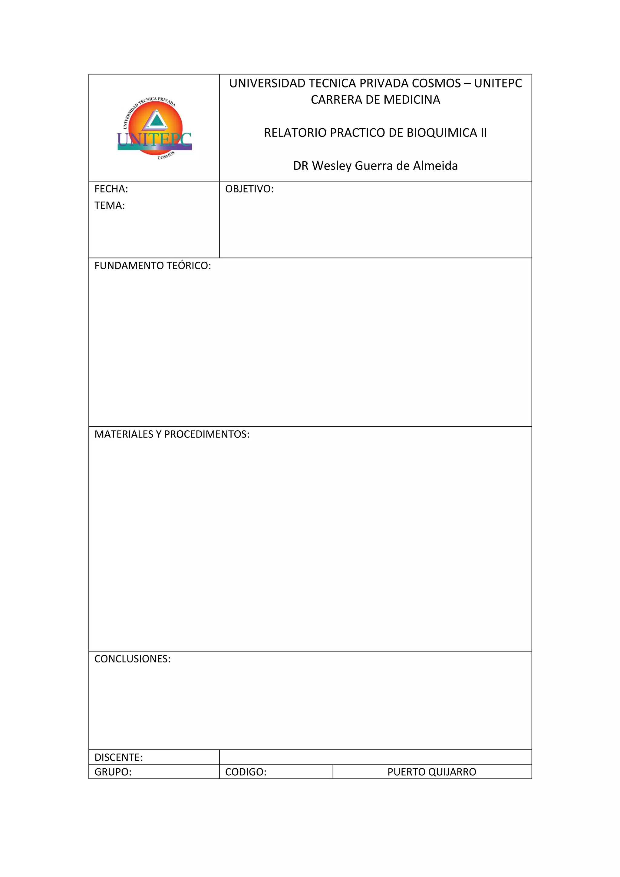 Este documento es un informe práctico de Bioquímica II realizado por un estudiante de medicina. El informe describe un experimento sobre un tema de Bioquímica II y presenta los objetivos, fundamentos teóricos, materiales y procedimientos utilizados, así como las conclusiones obtenidas.
