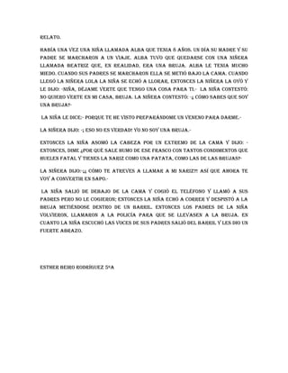 El documento presenta un relato sobre una niña llamada Alba que se queda con una niñera llamada Beatriz mientras sus padres están de viaje. Alba sospecha que Beatriz es en realidad una bruja. Cuando la niñera intenta convertir a Alba en sapo, la niña logra escapar y llamar a sus padres. Al regreso de los padres, la policía se lleva a la bruja.