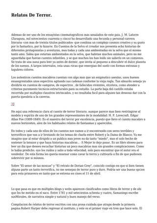 El documento presenta una recopilación de varios relatos de terror y cuentos macabros. Describe historias sobre seres terribles y terroríficos surgiendo en conversaciones entre personajes, y sobre castillos con intrincados claustros y cavernas ocultas. También menciona a autores clásicos de terror como Edgar Allan Poe y su influencia en llevar el cuento macabro a nuevos horizontes más allá de fantasmas y aparecidos.