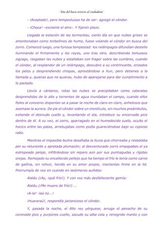 El documento presenta una serie de fábulas que abordan diversas lecciones morales a través de personajes como un cóndor y un zorro en disputa, un leñador enfrentando a termitas, un perro y una pulga discutiendo sobre la utilidad, y las estaciones del año defendiendo su importancia. A medida que se desarrollan estas historias, se evidencian temas de resistencia, venganza, ambición y el valor del amor. Cada relato culmina con una reflexión sobre las acciones de los personajes y sus consecuencias.
