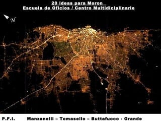 El documento presenta el análisis y propuestas de desarrollo para dos terrenos ubicados en el partido de Morón. Se caracterizan los terrenos y se identifican problemas como la falta de espacios verdes y actividades sociales. Se proponen como soluciones un Centro Multidisciplinario en uno de los terrenos que incluiría consultorios externos del hospital, y una Escuela de Oficios en el otro terreno para capacitación laboral. El objetivo general es mejorar la calidad de vida de los vecinos a través de estas intervenciones