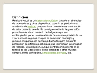 La realidad virtual es una representación electrónica de la realidad que nos da la sensación de estar interactuando en un entorno real. Se logra mediante imágenes generadas por computadora que son vistas a través de un casco y complementadas con trajes y guantes con sensores. La realidad virtual elimina la frontera entre lo real y lo irreal y permite la creación de entornos compartidos de interacción sin necesidad de compartir el mismo espacio-tiempo físico. Existen dos tipos de realidad virtual, inmersiva que usa cascos y guantes, y no inmers