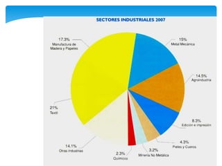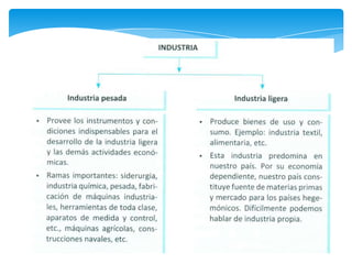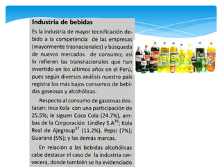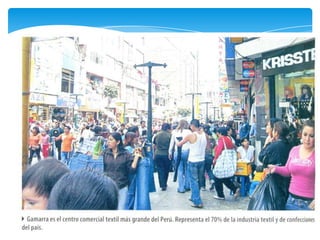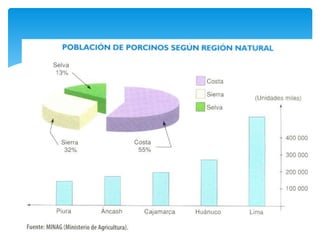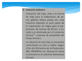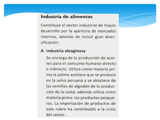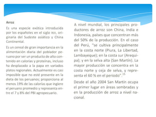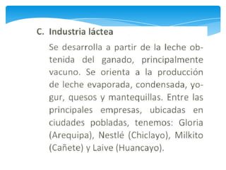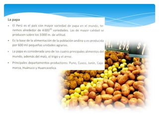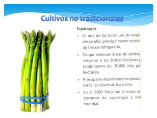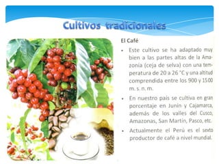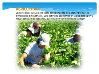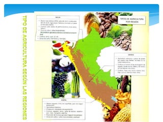 El documento habla sobre la agricultura en el Perú. Explica que la agricultura consiste en el cultivo de la tierra para obtener productos alimenticios e industriales y es la actividad económica en la que participa la mayor cantidad de peruanos. Luego describe los diferentes tipos de tierras y cultivos según la zona geográfica, así como las principales obras de irrigación. También menciona que la ganadería consiste en la crianza de animales domésticos con fines alimenticios e industriales. Finalmente, resume la distribuc