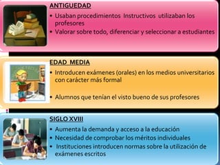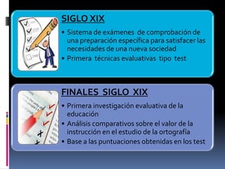 Este documento describe la historia de la evaluación educativa. Comenzó con el interés por medir científicamente la conducta humana y recibió influencias conductistas. Ralph Tayler se considera el padre de la evaluación educativa moderna por publicar su obra sobre el currículo e integrar un método sistemático de evaluación en 1950. La evaluación ya no es solo una medición sino que implica un juicio de valor y tiene el objetivo de determinar el cambio en los estudiantes y medir la eficacia de los programas educativos.