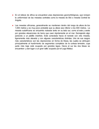 El relieve de África se caracteriza principalmente por mesetas y llanuras, con pocas montañas. Las cordilleras más importantes son el Atlas en el norte y los montes Drakensberg en el sur. El continente también contiene dos grandes desiertos, el Sahara y el Kalahari, así como la Gran Fractura de África, una grieta de 3.000 km que corre de norte a sur. Geológicamente, África se encuentra sobre una antigua placa tectónica que está dividiéndose, creando el Gran Valle del Rift
