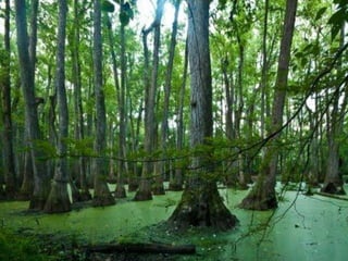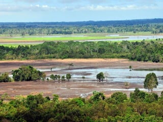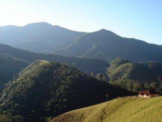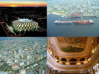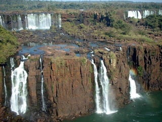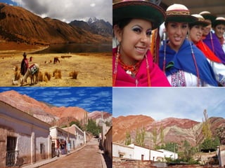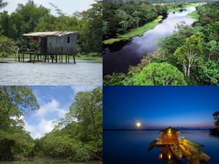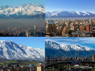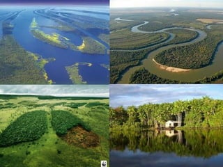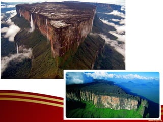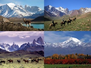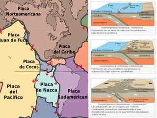 El documento divide el relieve de América en tres categorías: mesetas o macizos al este, llanuras al centro, y montañas al oeste. Detalla los principales macizos, llanuras y cadenas montañosas de América del Norte y del Sur, incluyendo el Escudo Canadiense, los Montes Apalaches, el Macizo Guayánico, el Macizo Brasileño, el Macizo Patagónico, la Llanura del Mississippi, la Llanura del Orinoco, la Llanura Amazónica, la Llanura Chaco