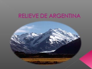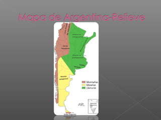 La Cordillera de los Andes en Argentina se divide en tres sectores principales y hay otras formaciones montañosas como las Sierras Subandinas. Grandes extensiones del este del país son llanuras como la Pampeana y la chaqueña. También hay mesetas como la patagónica y la misionera. Debido a su gran extensión latitudinal, Argentina tiene una gran variedad de condiciones geográficas que proporcionan recursos naturales importantes.