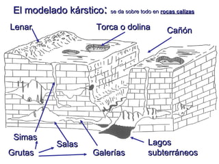 El documento describe cómo el tipo de roca subyacente influye en la forma del relieve. Explica que las rocas calizas están sujetas a un proceso de modelado kárstico que crea formaciones como grutas, simas y dolinas debido a la disolución del carbonato cálcico por el agua con CO2. También describe cómo el granito se meteoriza en formas redondeadas creando un paisaje de "caos en bolas" y torres cuando las bolas se apilan.