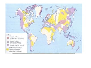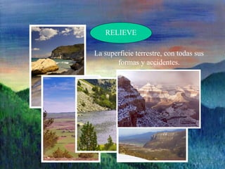 Este documento describe los procesos geológicos que dan forma al relieve terrestre. Explica que el relieve es el resultado de la acción conjunta de agentes geológicos externos e internos. Los agentes externos como el agua, el viento y los cambios de temperatura erosionan las rocas y transportan los sedimentos, mientras que los procesos internos como el magmatismo y el metamorfismo crean nuevas formas de relieve. También analiza la formación de cordilleras a través de procesos tectónicos de placas y describe los riesgos