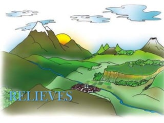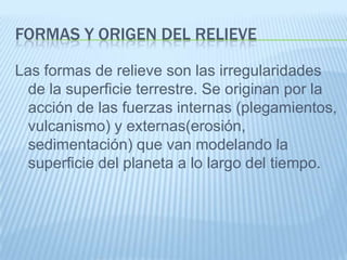 Las formas de relieve se originan por la acción de fuerzas internas como plegamientos y vulcanismo, y externas como erosión y sedimentación. Las montañas se originan por plegamientos o erupciones volcánicas asociadas con placas tectónicas, mientras que las mesetas son elevaciones de variada altitud cuya superficie tiende a la horizontalidad. Las penillanuras son formas bajas de relieve caracterizadas por suaves ondulaciones y cerros residuales.