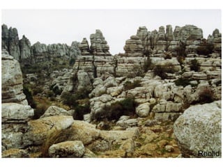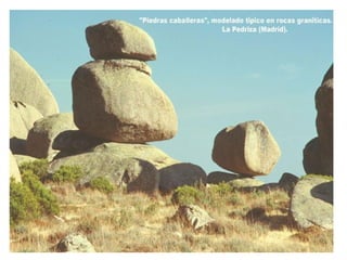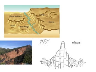 El documento describe los procesos de modelado del relieve terrestre. Los principales procesos son los geológicos externos como la erosión por ríos, glaciares, viento y mar. También se describen los procesos geológicos internos como los terremotos y volcanes. Además, se explican los factores que influyen en la forma del relieve como el tipo de roca, clima, estructura geológica y antigüedad. Finalmente, se detallan varios procesos específicos y las formas de relieve que generan
