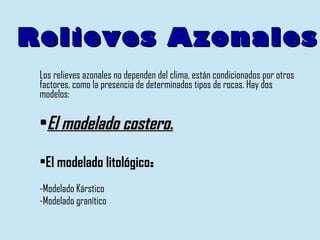 Este documento describe los diferentes tipos de relieves costeros y los procesos geológicos que los forman. Explica las entradas y salientes costeras como golfos, bahías, penínsulas, cabos, tómbolos e islas. Luego describe formas litorales como playas, flechas litorales, marismas y albuferas. Finalmente, detalla los principales agentes externos que moldean la costa como las mareas, el oleaje y las corrientes oceánicas.