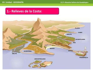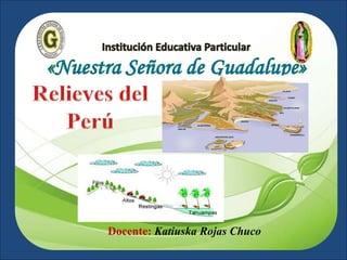 Este documento describe los principales relieves geográficos de las tres regiones naturales del Perú: la costa, la sierra y la selva. En la costa se encuentran bahías, penínsulas, playas, valles, desiertos, depresiones y estribaciones andinas. En la sierra hay cordilleras, montañas, volcanes, mesetas y valles interandinos. Y en la selva existen lomas, colinas, restingas y tahuampas.