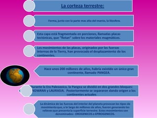 Los movimientos orogénicos se refieren al plegamiento o fractura de bloques de la corteza terrestre, mientras que los movimientos epirogénicos son ascensos y descensos lentos de las placas tectónicas. En las zonas de contacto entre placas ocurren grandes movimientos telúricos como terremotos y maremotos. El relieve de América se divide en tres partes: montañas jóvenes en el oeste, grandes llanuras en el centro debido a hundimientos e inundaciones, y mesetas