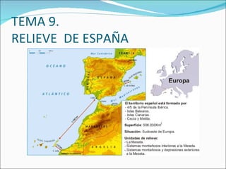El documento describe las principales unidades de relieve de España. Se divide el relieve en unidades interiores como la Meseta, el Sistema Central y exteriores como los Pirineos, Cordilleras Béticas y depresiones del Ebro y Guadalquivir. También menciona las islas Baleares y Canarias.