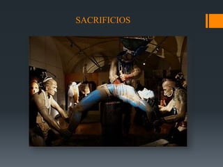 Los aztecas eran politeístas que adoraban a varios dioses importantes como Huitzilopochtli y Tezcatlipoca. Su religión involucraba prácticas de sacrificios humanos donde la sangre de animales y seres humanos era ofrecida a los dioses, como extraer el corazón de un guerrero vivo para alimentar a Huitzilopochtli. También sacrificaban niños a Tlaloc en las montañas creyendo que más llantos traerían más lluvia.
