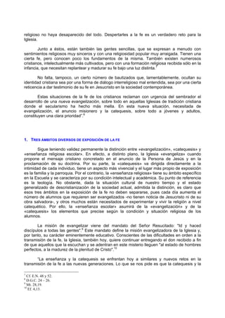 2. Se distinguen tres ámbitos para la transmisión de la fe: la evangelización, la catequesis y la enseñanza religiosa escolar. Si bien son distintos, deben complementarse dado el estado de descristianización de la sociedad.