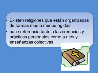 El documento define religión como las creencias y prácticas acerca de lo considerado divino o sagrado. Explica que existen diferentes tipos de religión como monoteístas, politeístas y no teístas. También describe las principales familias de religiones como las abrahámicas, dhármicas e iranias. Finalmente, señala que la cultura incluye los saberes, creencias y conductas de un grupo social transmitidos a través de sus medios materiales y actos como la alimentación y el lenguaje.