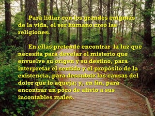 El documento contrasta la religión y la espiritualidad, señalando que mientras la religión se ha institucionalizado y se centra en rituales, dogmas e intereses de poder, la espiritualidad es más personal, promueve la reflexión crítica y la búsqueda interior para alcanzar la paz, la libertad y la unión.