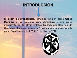 Santo Domingo de Guzmán fue un religioso español y santo católico que fundó la Orden de Predicadores, también conocidos como dominicos. Enseñó en la Universidad de Palencia y más tarde comenzó a formar el movimiento de predicadores para convertir herejes al catolicismo. Fundó más de sesenta comunidades dominicas y falleció en Bolonia en 1221.