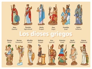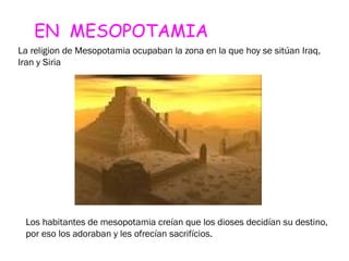 El documento describe brevemente las principales religiones de Mesopotamia, Egipto, Grecia y Roma. En Mesopotamia, los habitantes creían que los dioses controlaban su destino y les ofrecían sacrificios. En Egipto, el faraón era considerado descendiente de los dioses y su cuerpo era embalsamado después de morir. Los griegos practicaban una religión politeísta y tenían mitos que explicaban a los dioses. Los romanos asimilaron la religión griega aunque cambiaron los nombres de los dioses