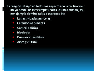 La religión dominaba todos los aspectos de la civilización maya. Los mayas eran politeístas y adoraban a varios dioses a la vez, cada uno asociado con una actividad o fenómeno natural específico. Su religión se basaba en elementos de la naturaleza y tenía un enfoque dualista reconociendo tanto el bien como el mal como divinos. Sus principales libros sagrados eran el Popol Vuh y varios libros mayas que fueron destruidos durante la conquista española.