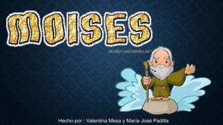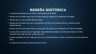 El documento resume la historia bíblica de Moisés, quien guió al pueblo de Israel fuera de Egipto hacia la Tierra Prometida. Describe cómo Moisés recibió los Diez Mandamientos de Dios en el Monte Sinaí y cómo utilizó su vara para dividir el Mar Rojo, permitiendo que los israelitas escaparan mientras los egipcios se ahogaban. También cuestiona algunos detalles históricos y arqueológicos de la narrativa bíblica.