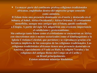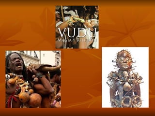 El documento describe varias religiones africanas tradicionales como el vudú y el rastafarismo. Explica que el vudú surgió en Haití en el siglo 18 y se expandió a Luisiana, combinando creencias africanas con elementos del catolicismo. Se centra en los loas o deidades menores, los sacerdotes y sacerdotisas que lideran rituales complejos con música, danza y ofrendas. También menciona las creencias fundamentales como un Ser Supremo distante y el uso de amuletos, pociones y hechizos