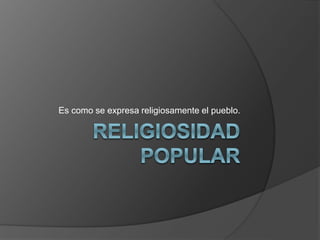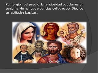 La religiosidad popular se refiere a las profundas creencias y actitudes básicas de un pueblo expresadas religiosamente. Estas expresiones son el resultado de la evangelización desde la conquista y se manifiestan a través de las fiestas religiosas celebradas anualmente, que reflejan el cristianismo y la espiritualidad única de cada pueblo.