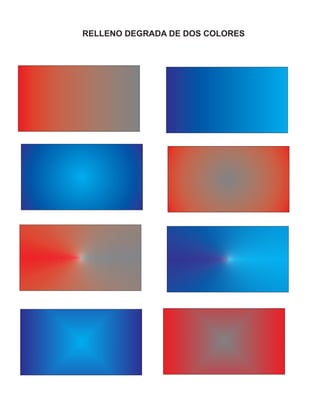 Este documento presenta instrucciones sobre diferentes tipos de rellenos para dibujar, incluyendo relleno uniforme, relleno uniforme con armonías, relleno degradado de dos colores, y aplicar un relleno degradado personalizado.