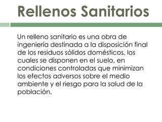 Un relleno sanitario es una obra de ingeniería destinada a disponer residuos sólidos domésticos en el suelo de manera controlada para minimizar efectos adversos ambientales y riesgos a la salud. El sitio debe tener espacio suficiente para almacenar los residuos generados por el área durante el período de diseño y ser localizado de forma que garantice la salud pública, condiciones ambientales y bienestar, minimizando incompatibilidades con los alrededores. Existen diferentes tipos de rellenos sanitarios y criterios ambientales para su