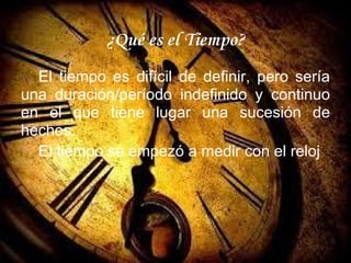 El tiempo ha sido medido a lo largo de la historia a través de diferentes tipos de relojes como los relojes de agua, de sol y mecánicos. En el siglo XIII se fabricaron los primeros relojes mecánicos en Inglaterra y en el siglo XIV aparecieron los relojes de resorte. En 1657, Christian Huygens inventó el reloj de péndulo, mientras que en el siglo XVIII hubo avances significativos en la precisión de los relojes. En la actualidad, existen relojes de
