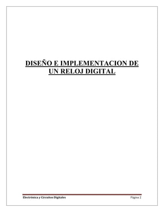 El documento describe el diseño y la implementación de un reloj digital utilizando circuitos integrados y componentes electrónicos básicos. Se abordan los objetivos del proyecto, la teoría detrás de los componentes usados como contadores y decodificadores, y los pasos para construir el circuito en una protoboard. Finalmente, se presentan conclusiones sobre la correcta implementación del reloj y se enfatiza la importancia del autoaprendizaje en el proceso educativo.