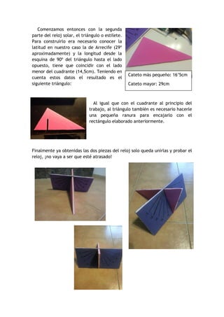 Este documento describe los pasos para construir un reloj solar casero utilizando materiales como cartón, cartulinas de colores, tijeras y regla. Explica cómo recortar un rectángulo para el cuadrante e incluir líneas horarias cada 15 grados con los números correspondientes. Luego, detalla cómo construir un triángulo para el estilete teniendo en cuenta la latitud del lugar, y encajar ambas piezas para completar el reloj solar.