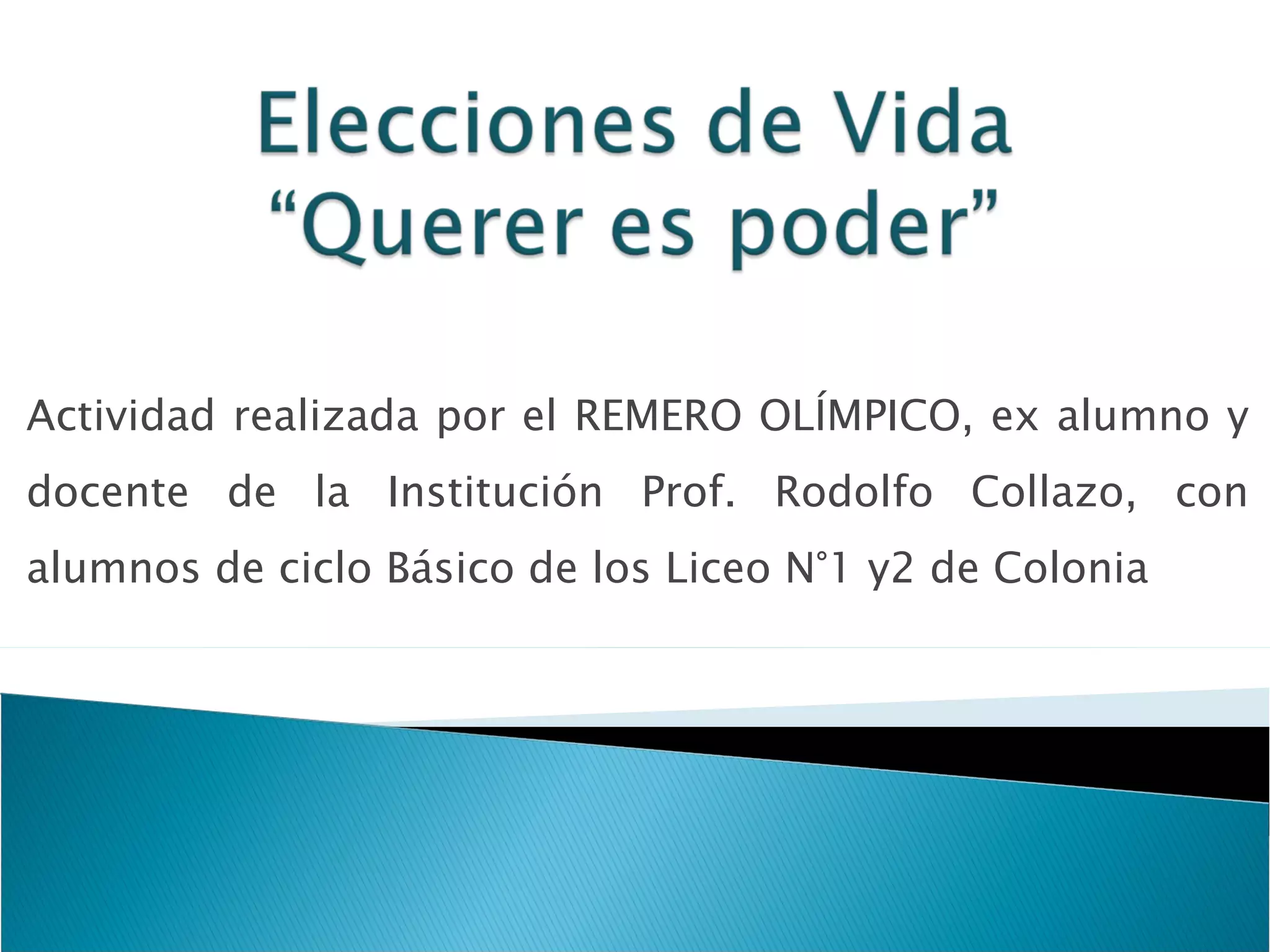 El remero olímpico Rodolfo Collazo visitó dos escuelas en Colonia para hablar con los estudiantes sobre la importancia del compromiso y el trabajo continuo para lograr objetivos a pesar de los desafíos. Su entrenador Ruben Scarpatti destacó que Collazo es un deportista amateur que ha competido en tres Juegos Olímpicos mejorando su marca cada vez, ganando medallas panamericanas y oros en los Juegos Odesur. Scarpatti también señaló que el remo ha aportado cuatro de las diez medallas ob