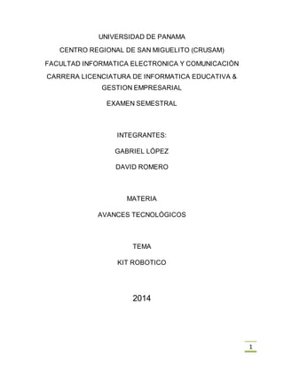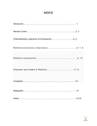 Este documento presenta información sobre el uso de kits robóticos en la educación y las empresas. En la educación, los kits robóticos pueden usarse para enseñar diferentes materias de manera práctica y divertida, desarrollando habilidades como la creatividad y el trabajo en equipo. En las empresas, los robots se usan comúnmente en la industria automotriz para realizar tareas repetitivas o peligrosas de una manera más precisa y consistente que los humanos. Algunas empresas líderes en robótica incluyen ABB y Ep