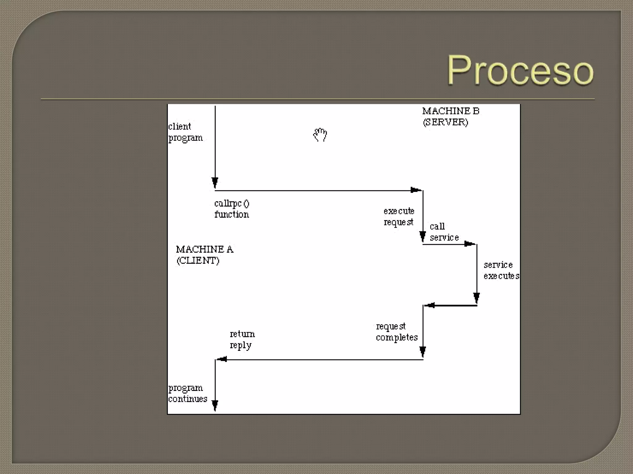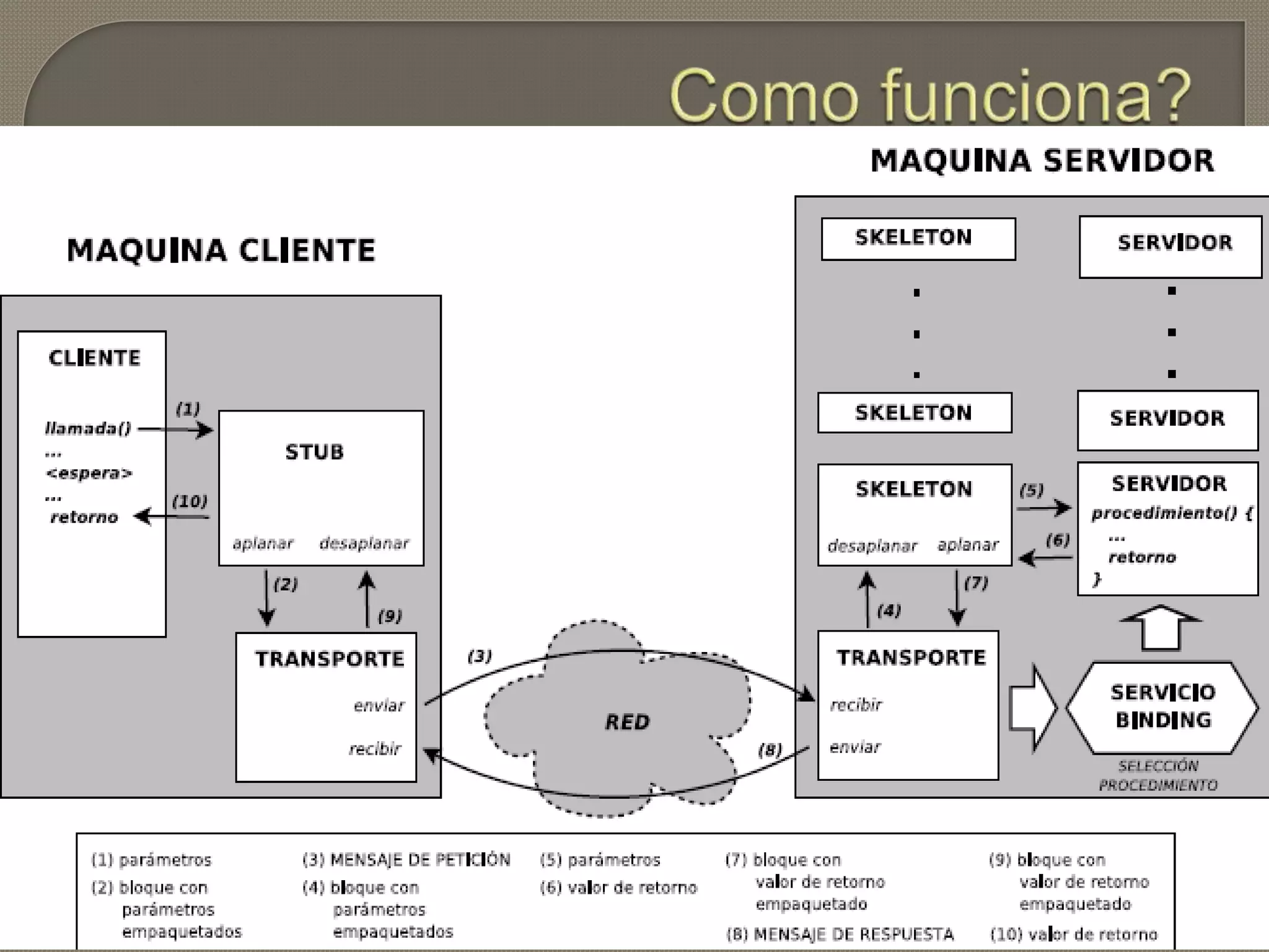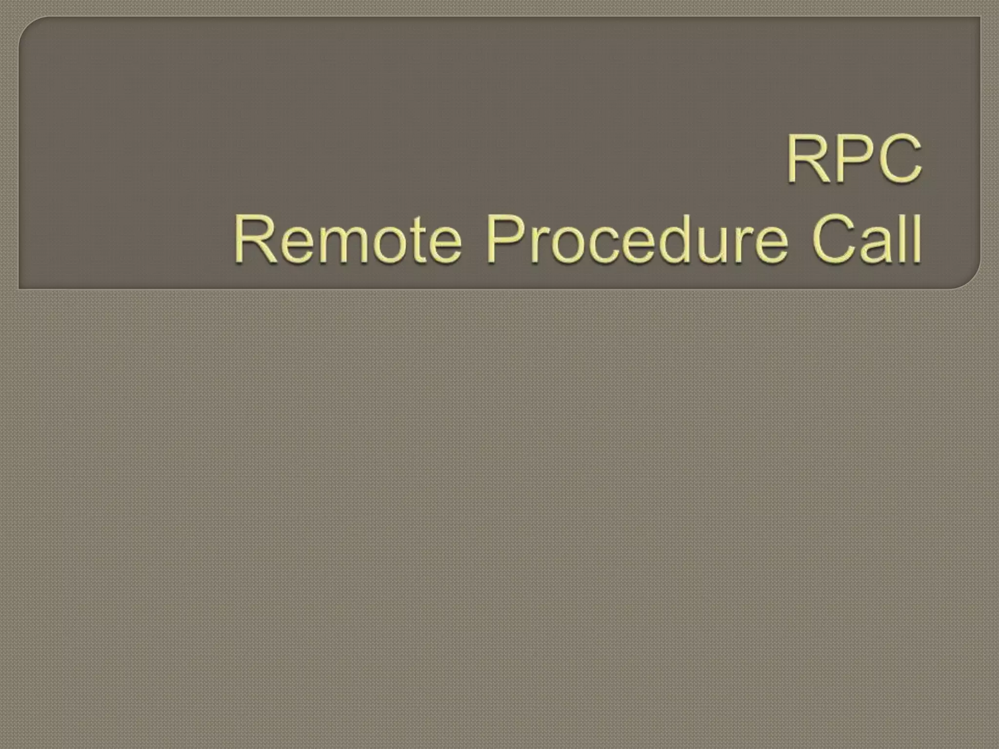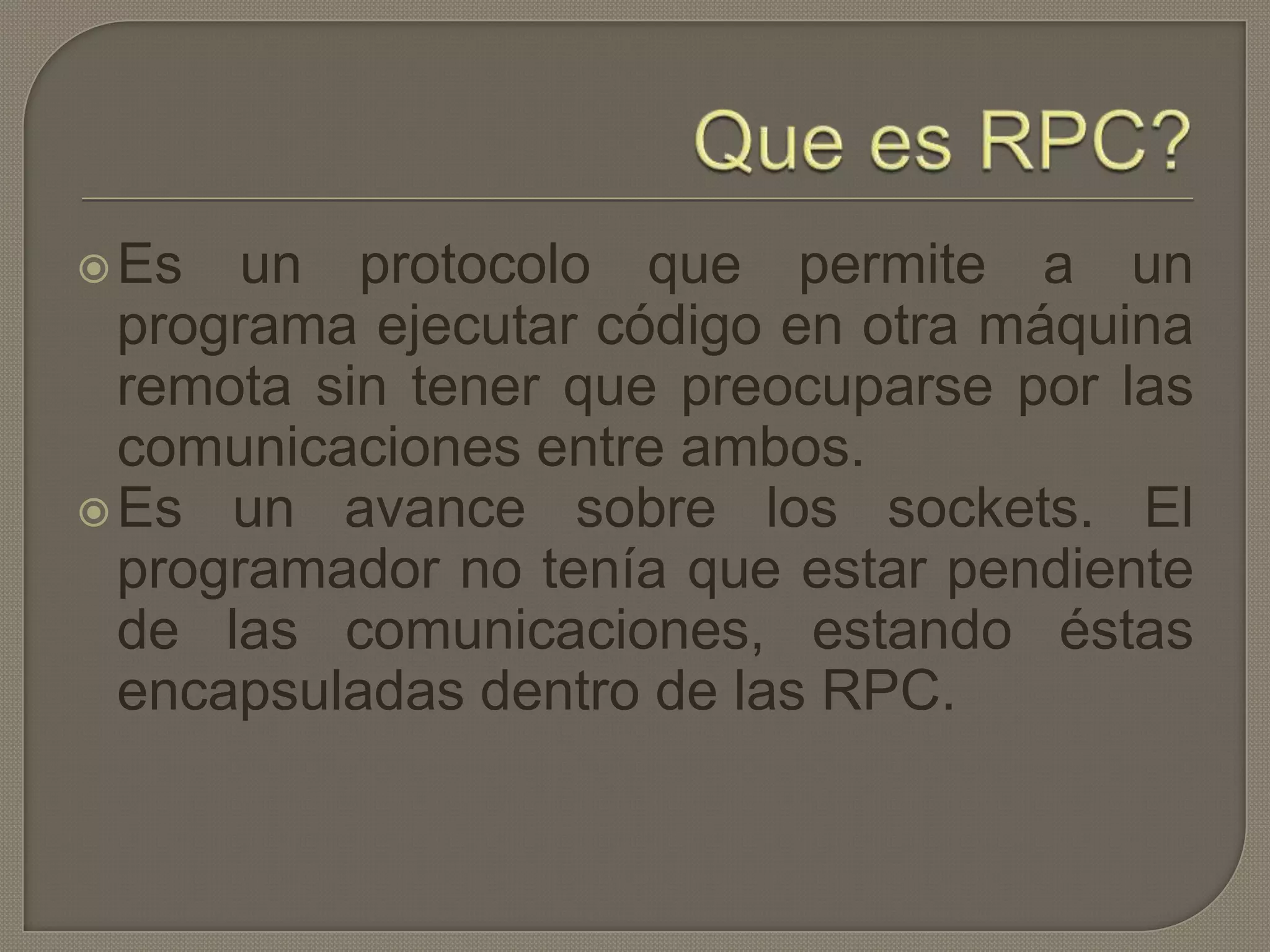El documento describe el protocolo de llamada a procedimiento remoto (RPC), el cual permite a un programa ejecutar código en otra máquina de forma remota sin preocuparse por las comunicaciones. RPC funciona a través de stubs y skeletons que encapsulan las comunicaciones entre el cliente y servidor, permitiendo al programador tratar las llamadas como si fueran locales. RPC se usa comúnmente para comunicación entre procesos en redes de computadoras.