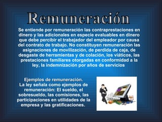 Este documento define qué constituye una remuneración y qué no, según la ley peruana. Explica que una remuneración incluye el sueldo, sobresueldo, comisiones, participaciones en utilidades y gratificaciones. No incluye asignaciones de movilización, perdidas de caja, viáticos ni prestaciones familiares. También establece que las remuneraciones deben pagarse entre lunes a viernes en el lugar de trabajo y dentro de la hora siguiente a la jornada, a menos que se acuerde otra fecha.