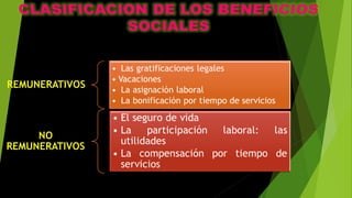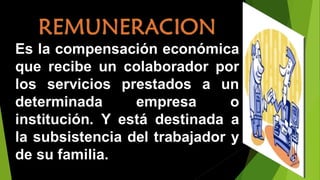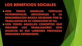 El documento describe varios tipos de remuneraciones y beneficios laborales a los que tienen derecho los trabajadores según la ley peruana, incluyendo vacaciones pagadas, bono de navidad, CTS (compensación por tiempo de servicios), seguros de vida y seguro contra invalidez permanente.