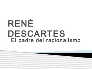 René Descartes fue un filósofo, matemático y científico francés considerado el padre del racionalismo. Nació en 1596 y murió en 1650. Formuló la frase "pienso, luego existo" como la base del conocimiento seguro, y desarrolló el método cartesiano para alcanzar la verdad a través de la duda, la intuición y la deducción lógica. También hizo contribuciones importantes a las matemáticas como el sistema de coordenadas cartesianas.