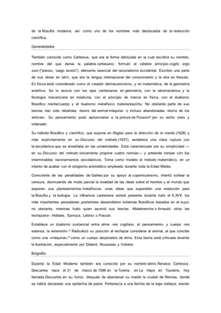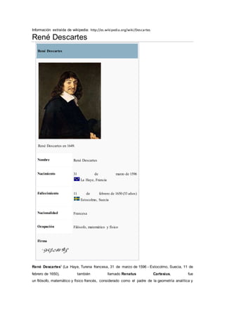 René Descartes fue un filósofo, matemático y físico francés del siglo XVII. Nació en Francia y estudió en un colegio jesuita donde se interesó por las matemáticas. Formuló el principio "pienso, luego existo" y estableció el dualismo entre mente y cuerpo. También hizo contribuciones importantes a las matemáticas como la geometría analítica y al método científico. Pasó la mayor parte de su vida adulta viajando por Europa y estableciendo las bases del pens