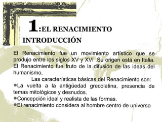 El documento resume las características y principales artistas del Renacimiento en Italia. Se divide en dos etapas: el Quattrocento en Florencia con figuras como Brunelleschi y el Cinquecento en Roma bajo el mecenazgo de los papas, con Miguel Ángel, Rafael y Leonardo da Vinci creando obras maestras. Florencia y Roma fueron los centros artísticos más importantes impulsados por familias como los Médici.