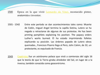 Los eruditos más destacados del período fueron Leonardo da Vinci, Copérnico, Vesalio, Tycho Brahe, Galileo, Giordano Bruno, Francis Bacon, Kepler, Harvey, Descartes, Boyle y Newton. Los años de mayor concentración de avances científicos fueron desde 1600 hasta 1611, con descubrimientos revolucionarios en astronomía, anatomía y física. Mientras tanto, la cultura ecuatoriana se desarrolló de 500 a 1500 d.C., basándose en el arte ceremonial y la subsistencia, hasta la llegada de los españoles.